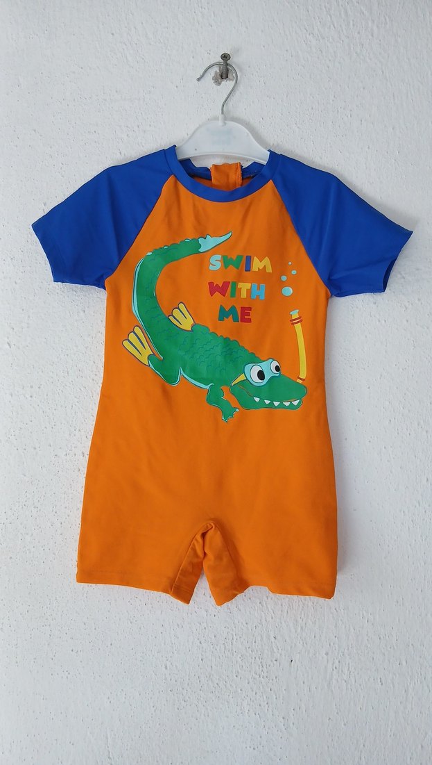 Kısa kollu, renkli ve baskılı erkek çocuk mayo tulumu. Önünde "Swim With Me" yazılı sevimli timsah figürü bulunur. Turuncu gövde ve mavi kollara sahiptir.