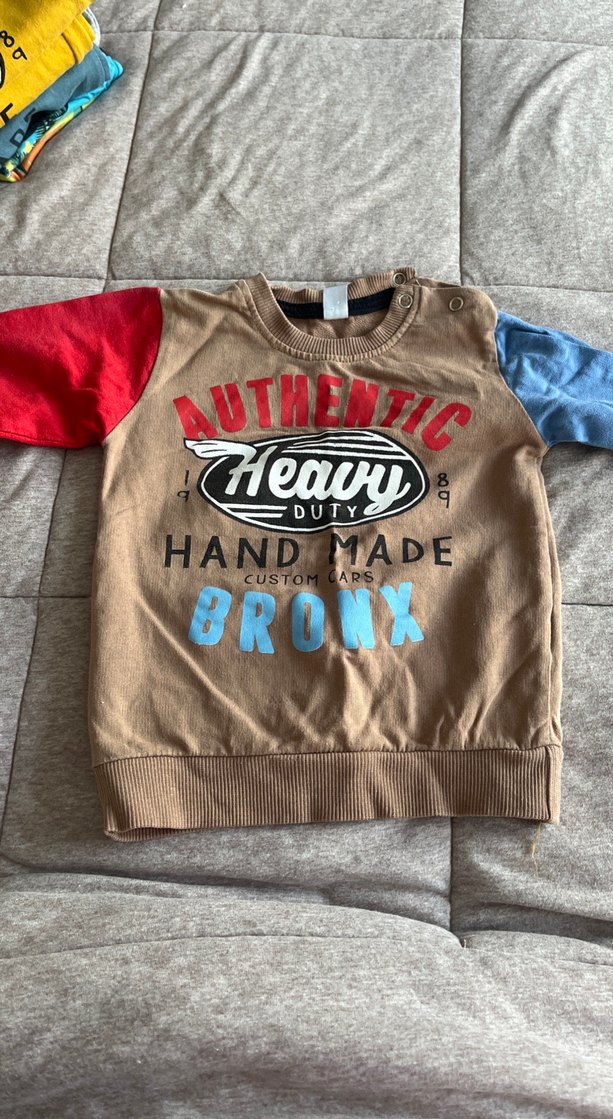 Erkek çocuk için kırmızı ve mavi renk kollu, kahverengi örme kumaştan yapılmış, bol kesim ve bisiklet yaka sweatshirt. Üzerinde 'Authentic Heavy Duty' ve 'Bronx' baskıları bulunur.