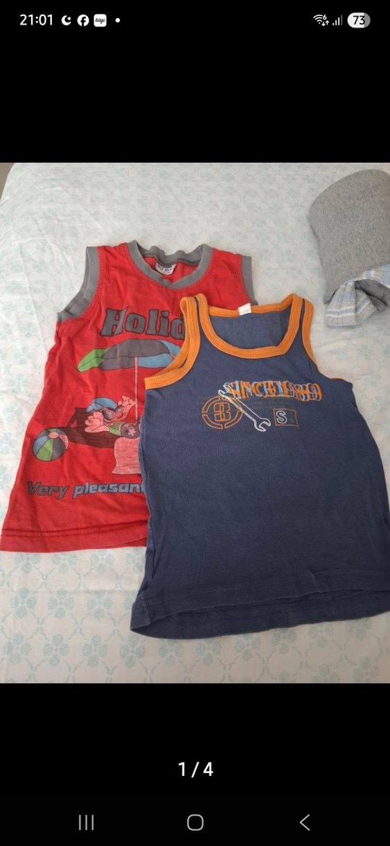 Renkli baskılı, kolsuz, bol kesim iki erkek çocuk tişörtü. Kırmızı tişörtünde velcro detayı bulunur.
