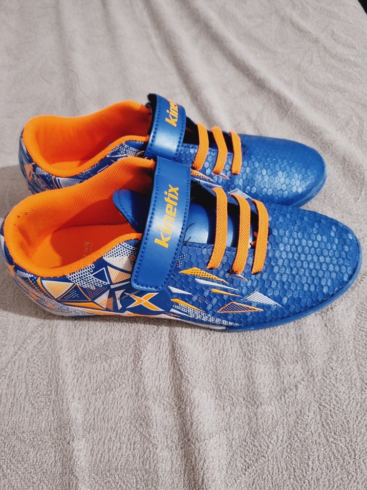 Mavi tabanlı renkli baskılı erkek çocuk spor ayakkabısı, turuncu iç astar ve kolay kapanan velcro bant ile sokak tarzına uygun.
