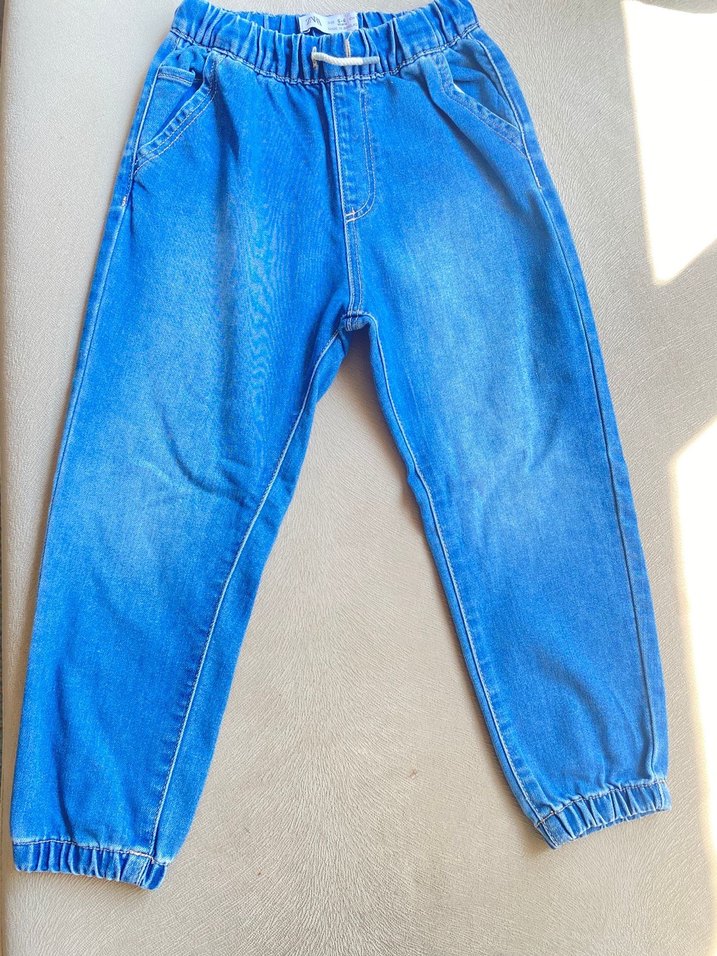 Rahat kesim, elastik bel ve paça detaylı, renkli mavi denim kumaştan üretilmiş erkek çocuk pantolonu. Zara marka
