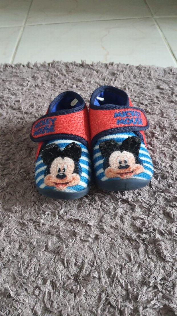 Renkli, nakışlı Mickey desenli, ayarlanabilir cırt cırtlı erkek çocuk ev terliği. Yumuşak ve sıcak tüylü kumaştan yapılmıştır.