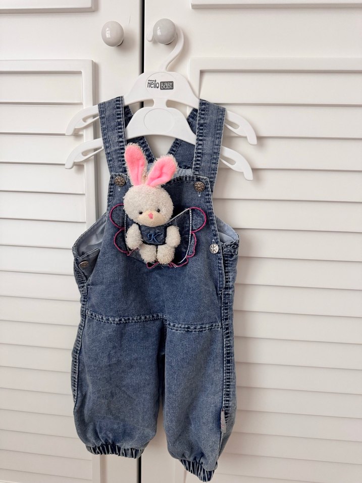 Rahat kesim mavi denim salopet, nakışlı desenler ve önünde örgü tavşan detayı bulunur. Askılı, konfor için lastikli paçalar.