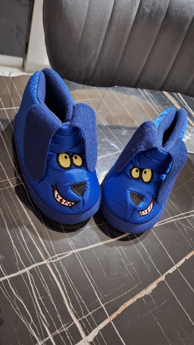 Erkek çocuklar için renkli nakışlı yüz detaylı, yumuşak kürk iç yüzeyli ve cırt cırtlı sıcak ev terliği. Sokak stiline uygun rahat tasarım.