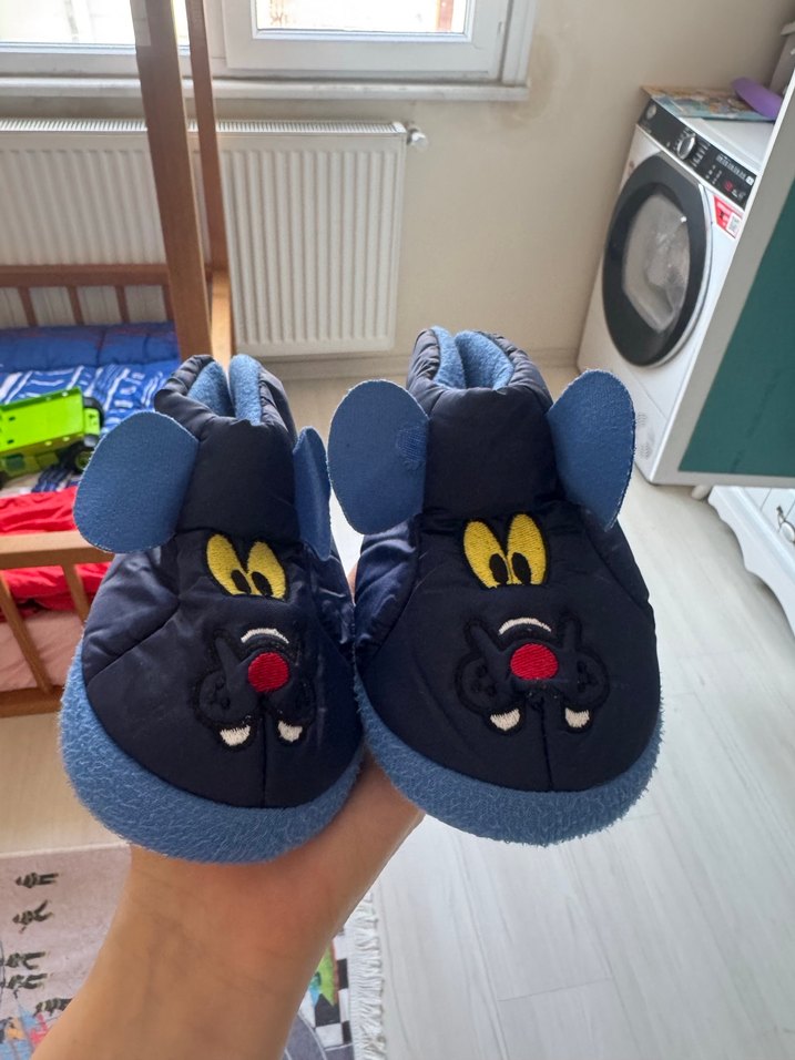 Erkek çocuklar için renkli nakışlı çizgi film yüzleri, yumuşak kürk kumaş ve kolay kullanımlı cırt cırtlı kapama özellikli sıcak ev terliği.