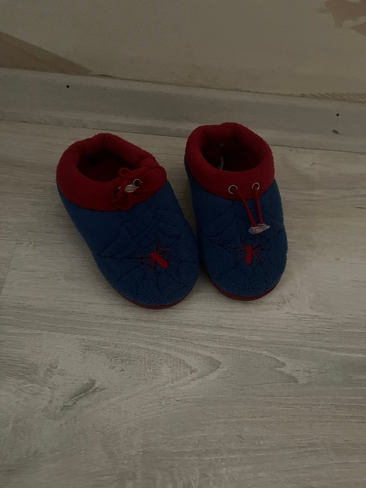 Yumuşak fleece kumaştan yapılmış, renkli nakışlı ve cırt cırtlı mavi erkek çocuk sıcak terlikleri. Rahat sokak tarzı için uygundur.