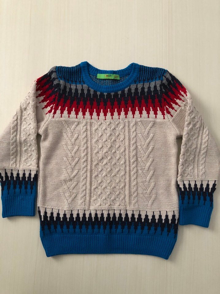 Erkek çocuk için bohem ve retro tarzda, renkli örgü desenli, bisiklet yaka ve uzun kollu, kazak.