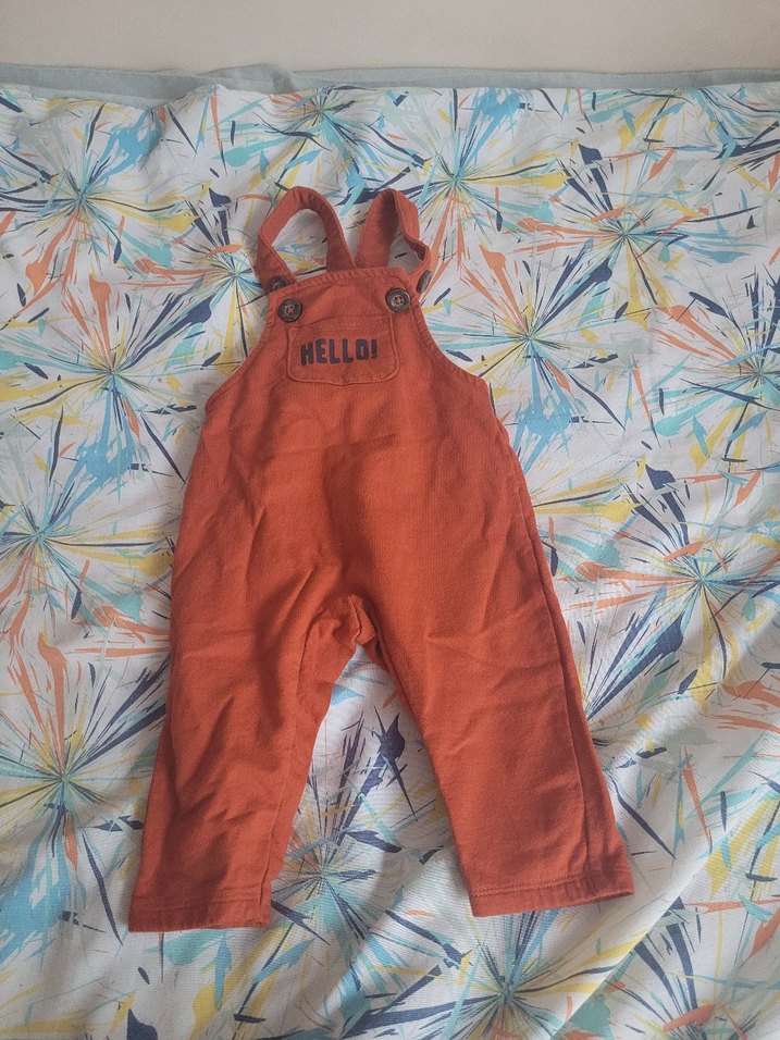 Renkli kahverengi, kolsuz, bol kesim erkek çocuk salopeti, göğüste "HELLOI" yazısı ile. Sokak stili için uygun.
