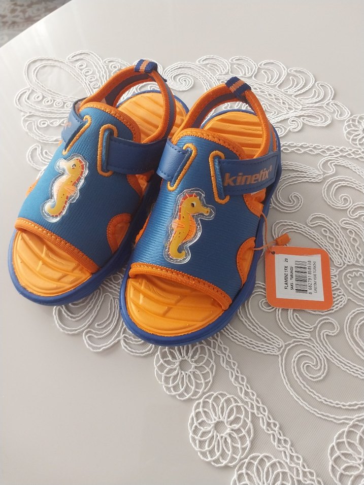 Erkek çocuklar için renkli baskılı, ayarlanabilir Velcro kayışlı kauçuk terlikler. Rahat ve dayanıklı, günlük sokak stili için uygundur. hiç kullanılmadı