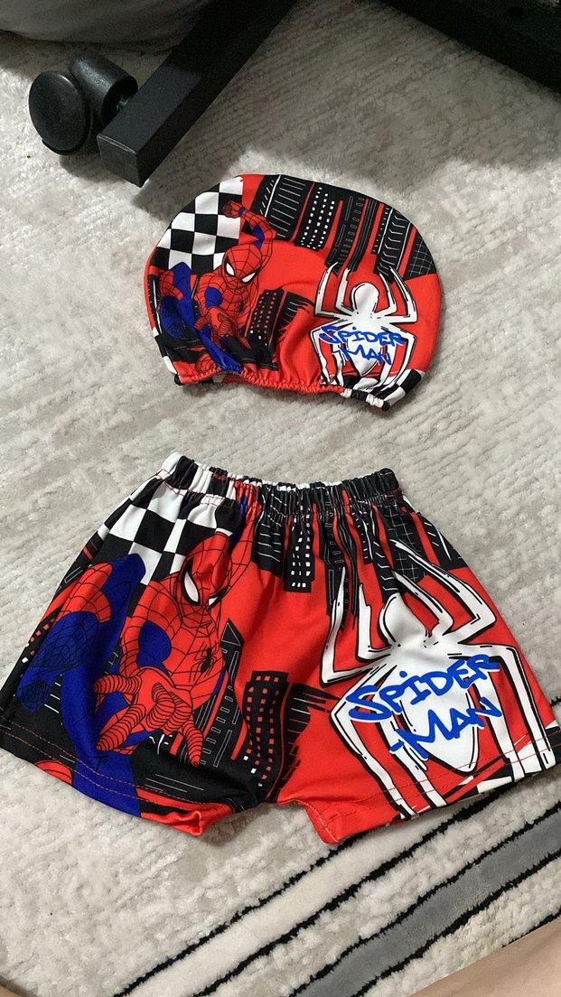 Renkli Spiderman baskılı, ayarlanabilir cırt cırtlı, sentetik kumaştan erkek çocuk şort ve şapka seti. Cesur sokak stili için uygundur.️