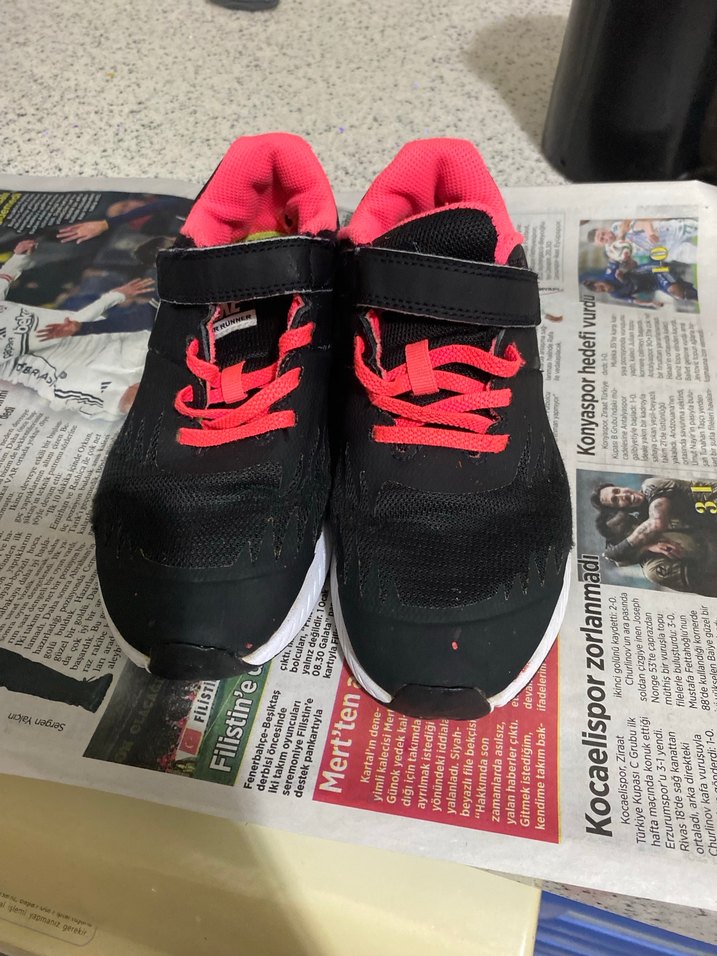 Kız çocuklar için renkli baskılı, kırmızı detaylı siyah spor ayakkabı. Kauçuk tabanlı ve kolay giyilmesi için cırt cırtlı bantlıdır.
