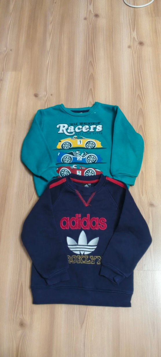 Uzun kollu, yuvarlak yaka ve bol kesim erkek çocuk sweatshirtleri. Biri renkli baskılı yarış arabası deseni, diğeri lacivert adidas yazılı örme detaylı. 2 adet sweatshirt