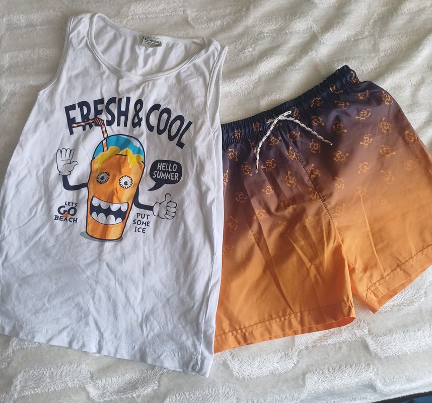 Erkek çocuk için bağcıklı renkli tie-dye şort ve yaz temalı baskılı beyaz kısa kollu tişört.