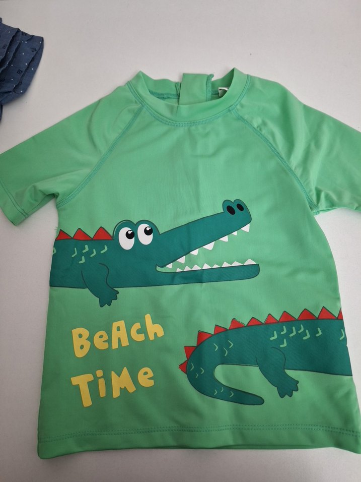 Renkli yeşil erkek çocuk mayo üstü, kısa kollu ve önünde 'Beach Time' yazılı eğlenceli timsah baskıları bulunur.