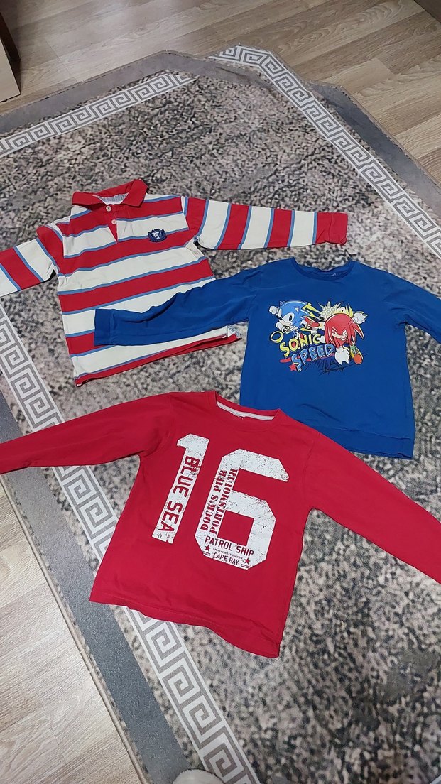 Erkek çocuklar için, rahat kesim, yakalı, yuvarlak yaka ve renkli baskılı, örme tekstil malzemeden yapılmış uzun kollu kırmızı tişört. 7 8 yaş..