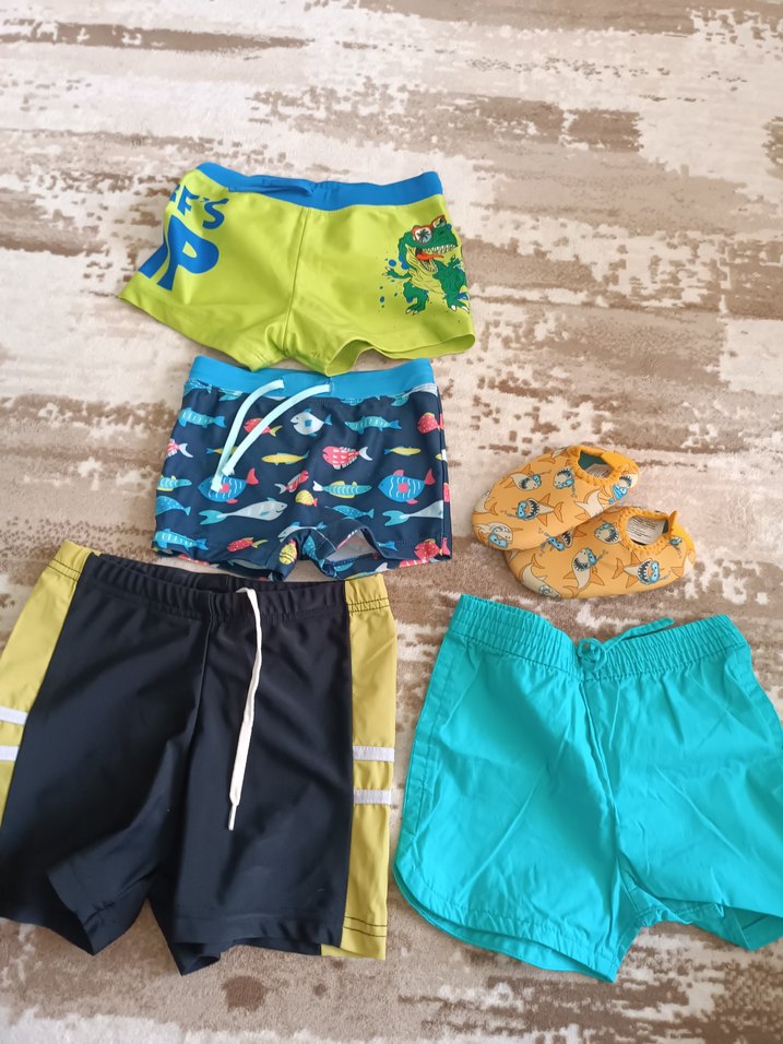 Renkli ve desenli erkek çocuk mayo ve şortları, elastik bel ve bağcık detaylı. Plaj veya havuz için uygun.