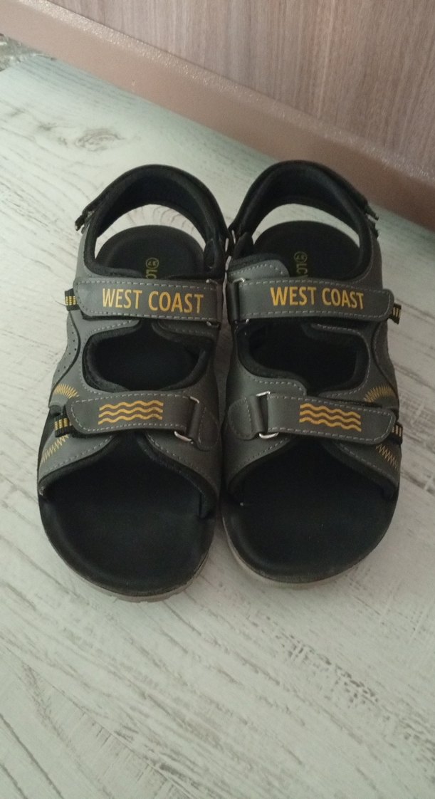 Gri baskılı, tokalı kayışlı, dayanıklı kauçuk malzemeden erkek çocuk terliği. Kayışlarda 'WEST COAST' yazısı bulunur. 37 numara sağlam erkek çocuk sandalet