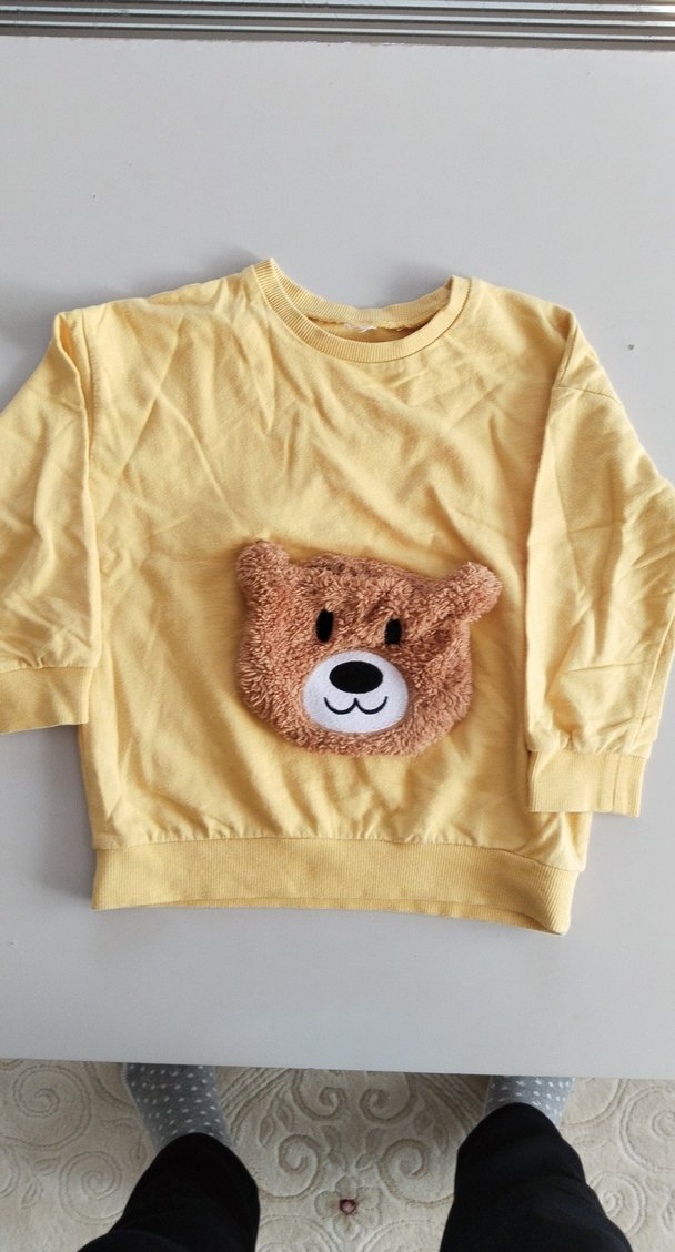 Sarı renkli, yuvarlak yakalı ve uzun kollu çocuk sweatshirtü. Rahat kesim, renkli baskı ve önünde yumuşak kürk detaylı ayıcık figürü bulunur.