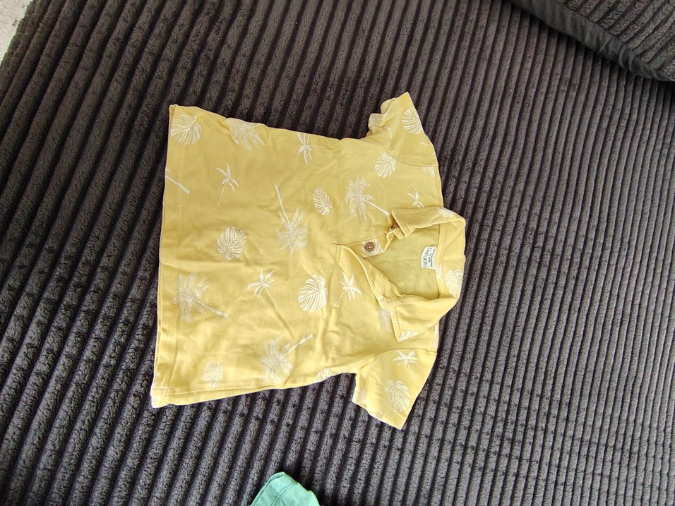 Erkek çocuklar için bol kesim, yakalı ve düğmeli önlü sarı pastel renkli baskılı polo tişört. Yumuşak sentetik kumaştan, rahat sokak stili için uygun.