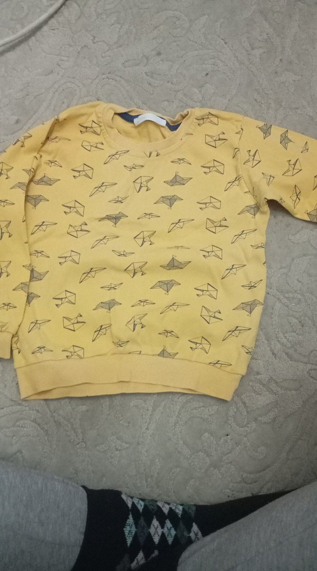 Erkek çocuklar için uzun kollu, yuvarlak yakalı, bol kesim sarı sweatshirt. Gri baskılı desenlerle süslenmiş, yumuşak ve sıcak dokulu üretilmiştir.