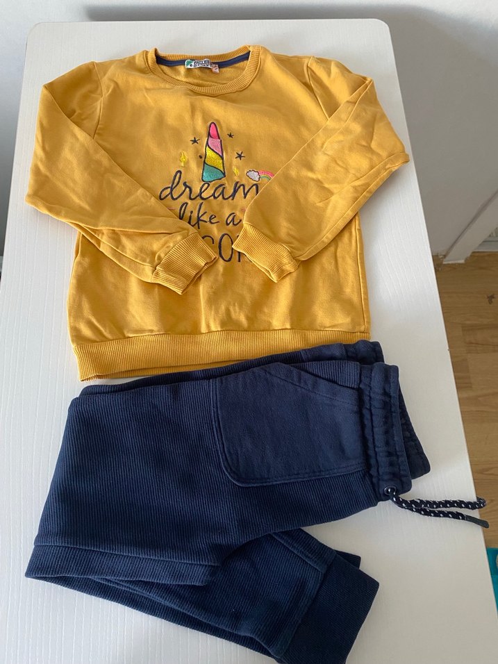 Erkek çocukları için rahat kesim, sarı baskılı sweatshirt ve lacivert eşofman takımı. Uzun kollu, bisiklet yaka, sokak stili rahatlığı sunar.