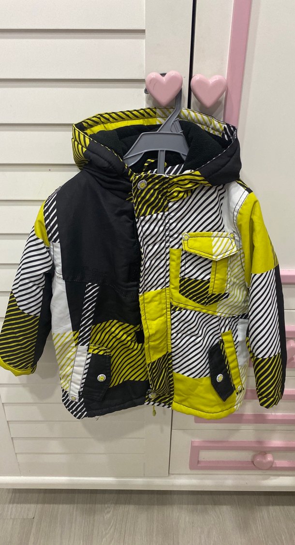 Erkek çocuk için sarı desenli, fermuarlı ve cepli, kesimli bir mont. Notch yaka ve modern sokak stili sunar.