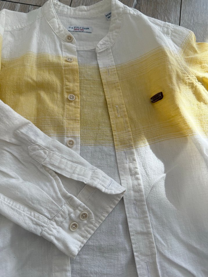 Erkek çocuklar için pamuk, açık sarı renkli, düğmeli, kısa kollu, yakalı ve bol kesim gömlek. Batik desenlidir.