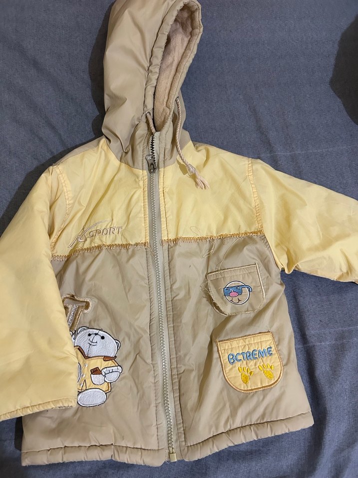 Erkek çocuklar için pastel sarı ve bej renk kombinasyonlu, nakış detaylı, fermuarlı ve notlu yaka kesimli, sıcak tutan mont. 2-3-4 yaşlar için uygundur
