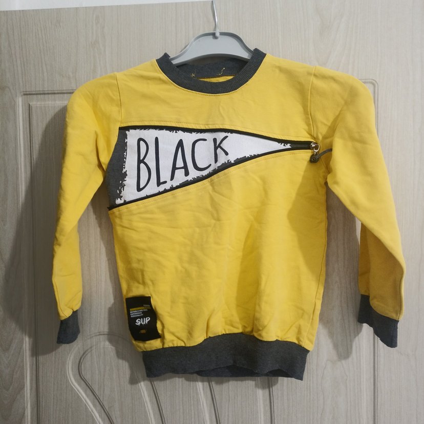 7-8 yaş için uygundur. Erkek çocuk sweatshirt, bol kesim ve uzun kollu, yuvarlak yaka. Sarı renk, koyu gri kenarlıklı, önünde 'BLACK' yazılı fermuarlı baskı. Yumuşak ve sıcak kumaştan, trend sokak stili için uygun.