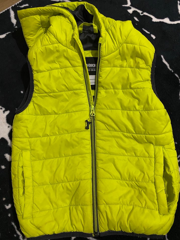 Fermuarlı, kolsuz, straplez yaka sarı renkli, erkek çocuklar için yumuşak ve sıcak kumaştan üretilmiş dar kesim yelek. 7-8 yaş yazmasına rağmen 5-6 yaş uyumludur.