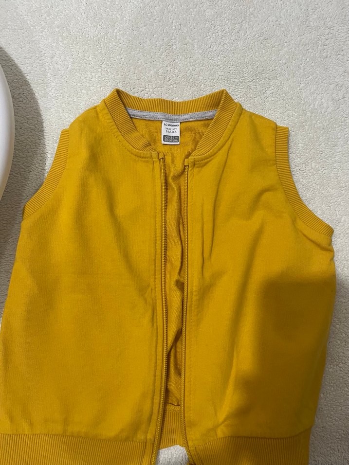 Bu erkek çocuk yeleği, fermuarlı ve yuvarlak yaka detaylarına sahip, parlak sarı renkte ve vücuda oturan kesimde yumuşak ve sıcak bir kumaştan üretilmiştir.