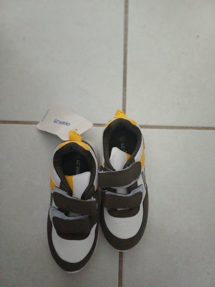 Sarı ve gri baskılı, kauçuk tabanlı ve cırt cırtlı erkek çocuk spor ayakkabısı, rahat ve trend sokak stili için uygundur.