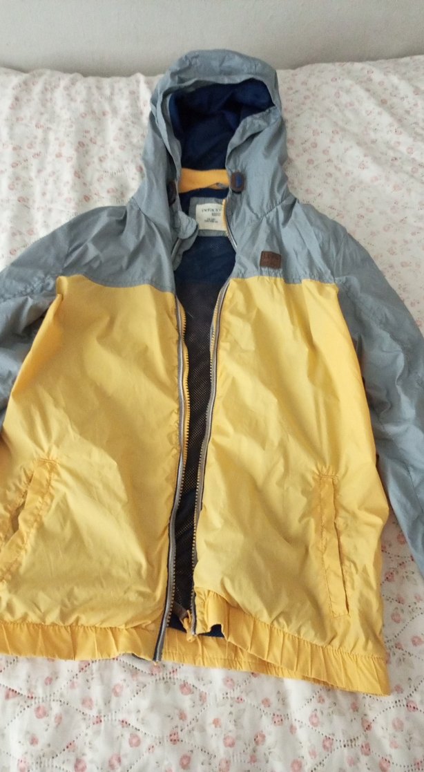 Erkek çocuklar için fermuarlı, sarı ve gri renklerde, bol kesim yağmurluk. Yumuşak ve sıcak fleece astarlı, notched lapel yakalı, sokak stiline uygun.