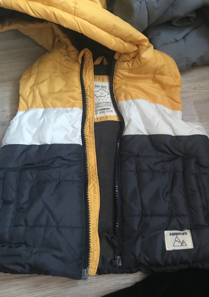 Sarı, gri ve beyaz renk bloklu, fermuarlı ve kolsuz erkek çocuk yeleği. Yumuşak ve sıcak kumaştan, dar kesim ve kesimli yaka detaylı.