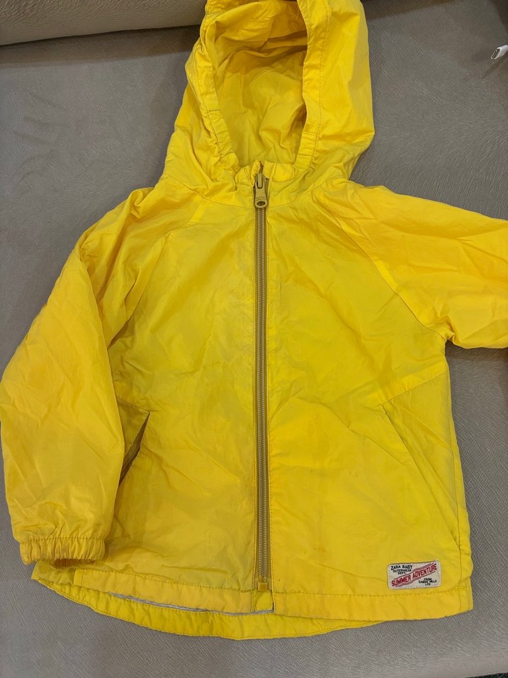 Sarı renkli, kapüşonlu ve fermuarlı erkek çocuk yağmurluğu.zara marka