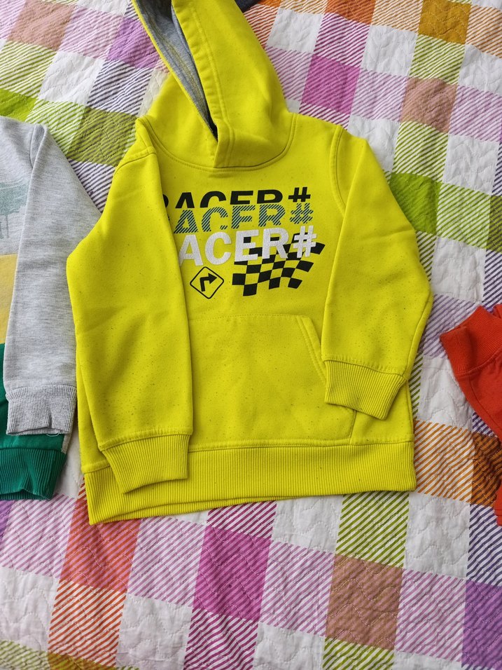 Erkek çocuklar için kapüşonlu, uzun kollu, yumuşak ve sıcak kumaştan yapılmış, renkli baskılı ve örme detaylı, vücuda oturan sarı sweatshirt. 'ACER#' yazısı ön taraftadır. 5 veya 6 yaş için uygundur, sarı olan sweatshirt satılıktır