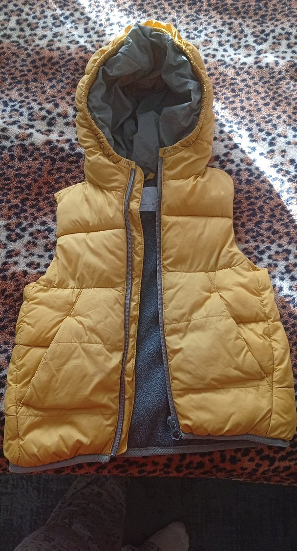 Erkek çocuklar için kapüşonlu, sarı renkte, kolsuz yelek. Yumuşak ve sıcak kumaştan, kürk detaylı, fitted kesim, streetwear tarzında, desensiz. kalem lekesi var belki cıkartabıkırsıniz hiç bi sorunu yok