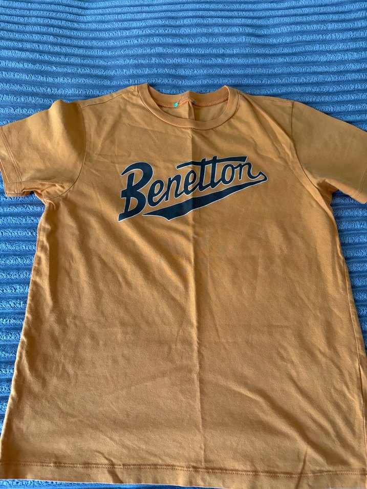 Erkek çocuklar için sarı pamuk tişört, bol kesim, kısa kollu ve bisiklet yaka. Önü Benetton baskılı, arkada düğmeli detaylı. Rahat ve günlük kullanıma uygun.