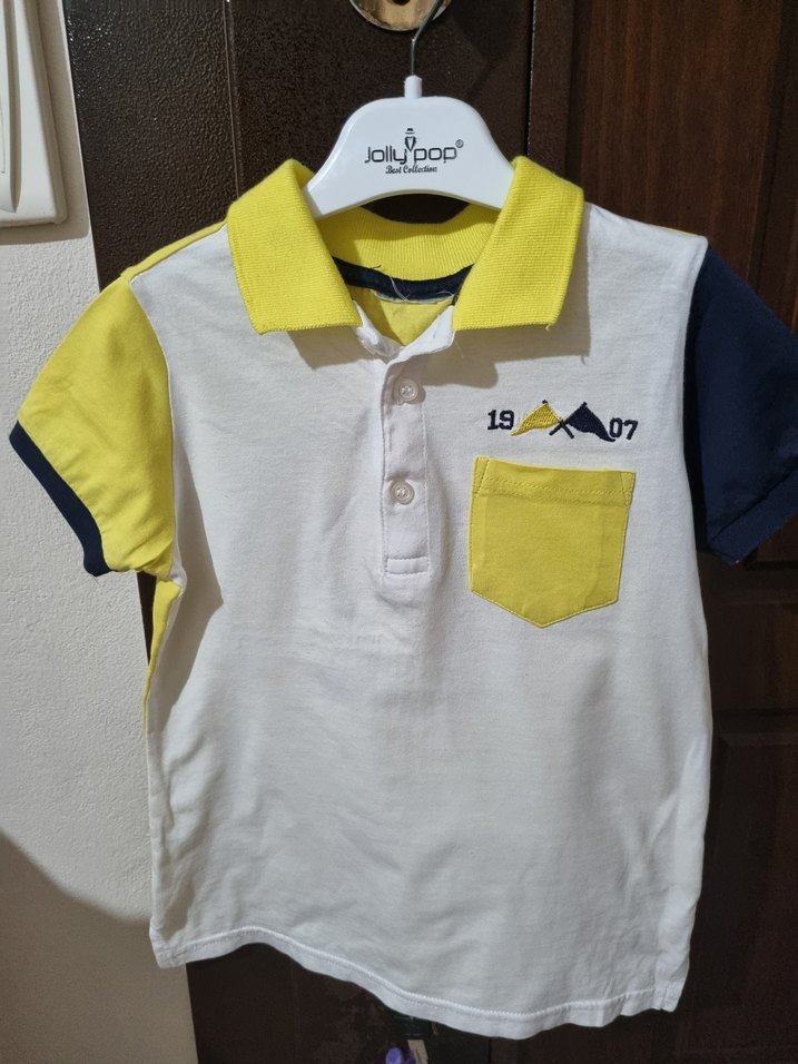 Pamuk kumaştan, düğmeli, kısa kollu, polo yaka erkek çocuk tişörtü. Açık sarı renk ve baskılı detaylara sahip, göğüs cepli, rahat kesim.