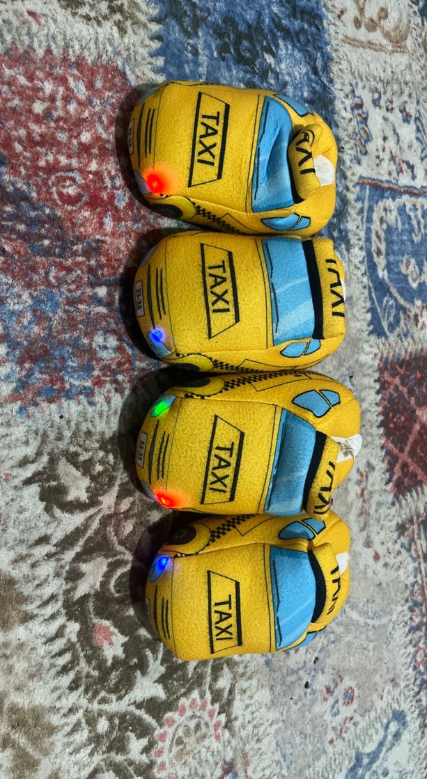 Sarı renkli, kaydırmaz tabanlı, baskılı taksi desenli, cırt cırtlı ve ışıklı detaylara sahip erkek çocuk terliği.