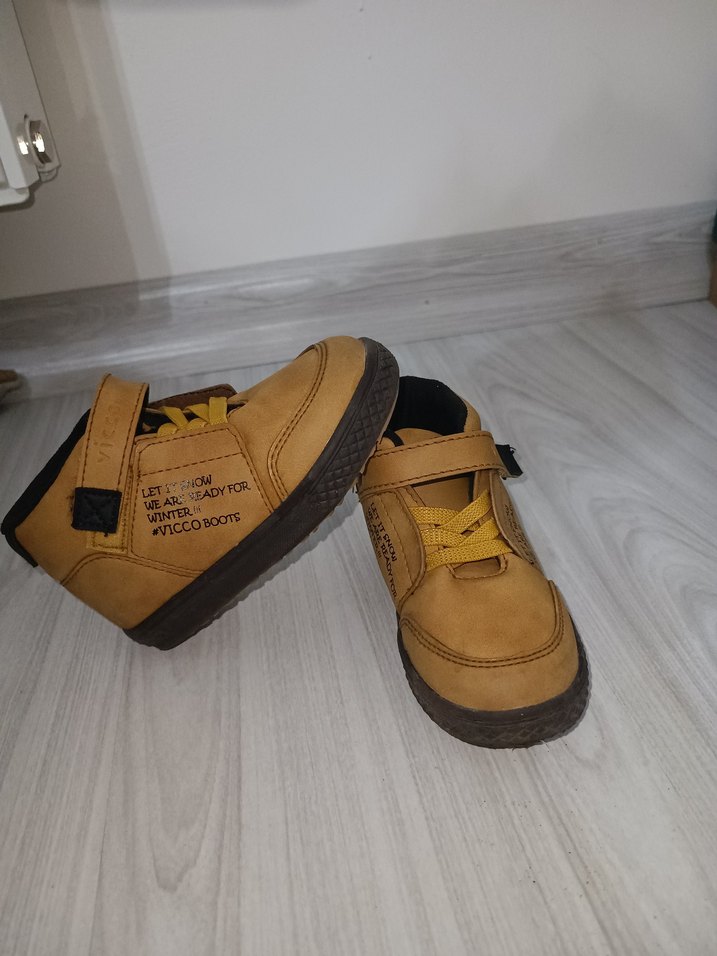 Parlak sarı renkli, baskılı detaylara sahip erkek çocuk botları. Vicco marka az kullanıldı kusuru yok.