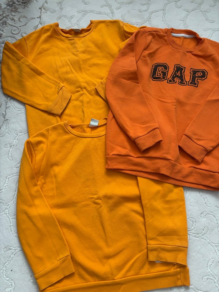 Uzun kollu, yuvarlak yaka, yumuşak kumaştan yapılmış koyu sarı erkek çocuk sweatshirtleri. Birinde GAP logosu bulunur, rahat bol kesim sunar. Sokak stili için uygun. Belirttiğim yerlerde ufak leke var çıkabilir okul için ideal