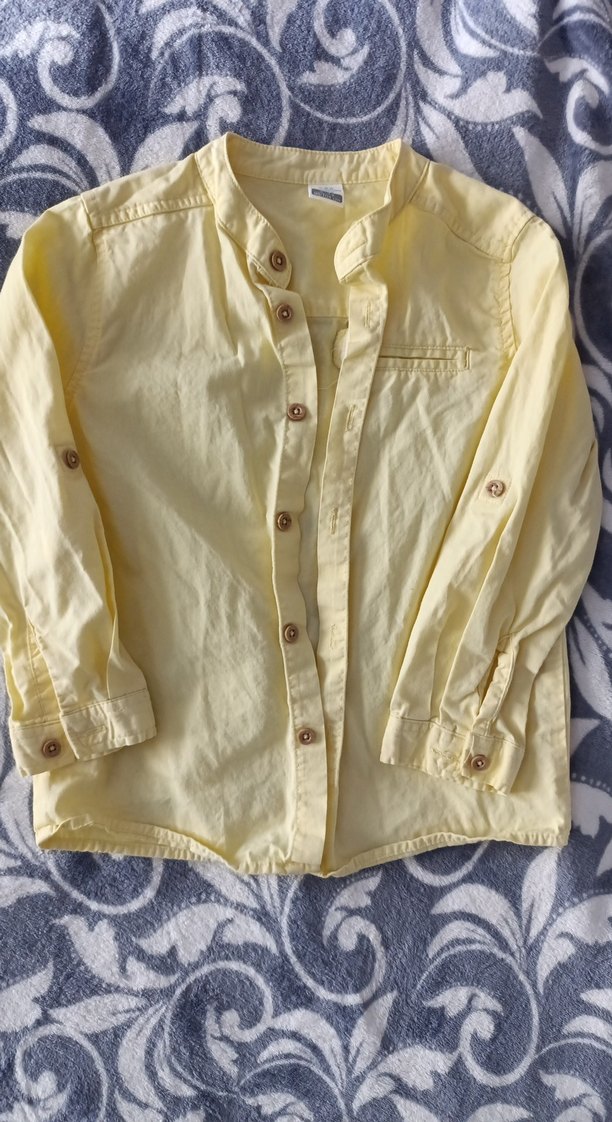 Erkek çocuk için pastel sarı renkte, düğmeli, yakalı, uzun kollu ve bol kesim gömlek.