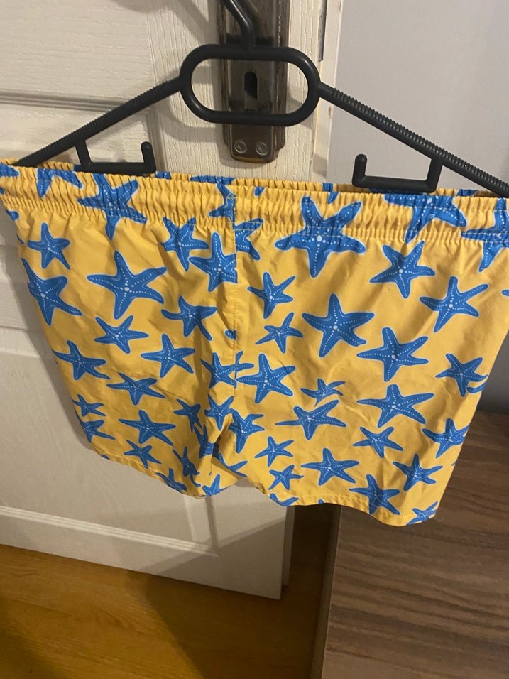 Sarı renkli, desenli karışık renkli mavi denizyıldızı desenli erkek çocuk mayosu. Parlak görünümlü ve lastikli bel bandına sahip. Plaj ve havuz için uygun.