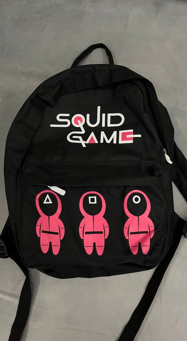 Yumuşak fleece kumaştan yapılmış koyu renkli, Squid Game temalı baskılı ve tokalı kadın sırt çantası. Spor ve sokak tarzına uygun.