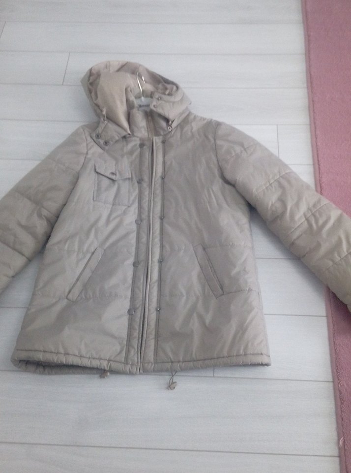 Bej renkli, düğmeli ve uzun kollu kadın kışlık mont. Yumuşak ve sıcak fleece kumaştan, normal midi boyunda, rahat ve sade tasarım.sadece 2 defa kullanılmış tertemiz yırtık sökük deforme yok