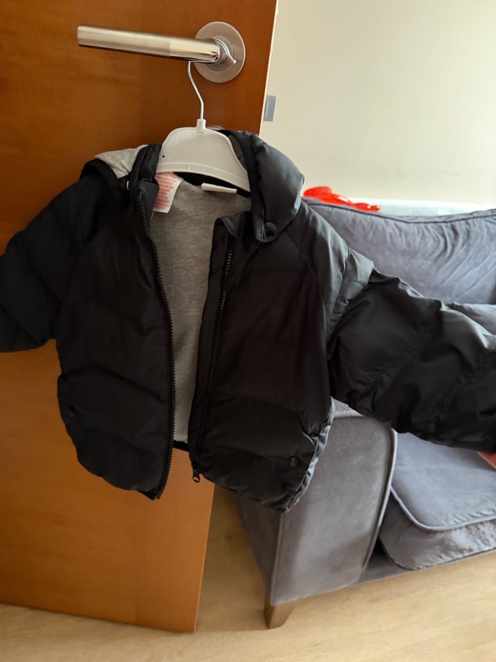 Bu siyah kapüşonlu erkek çocuk montu, fermuarlı. Yumuşak ve sıcak kumaştan üretilmiştir, şık ve rahat bir tarza uygundur.