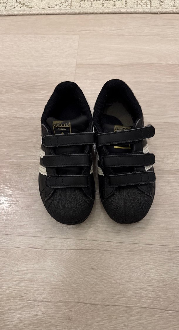 Siyah Adidas erkek çocuk spor ayakkabısı, cırt cırtlı ve kauçuk tabanlı, sade sokak stiliyle tasarlanmıştır.