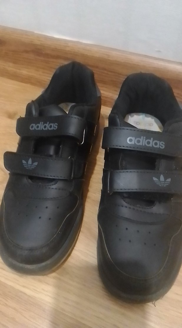 Erkek çocuklar için siyah Adidas spor ayakkabı, tokalı bantlarla ve kauçuk tabanlı, trend sokak stili için uygun.