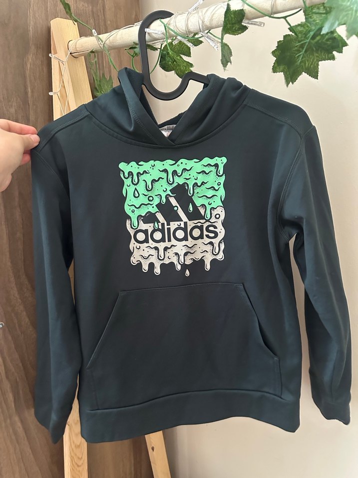 Siyah, uzun kollu erkek çocuk sweatshirtü, bol kesim ve bisiklet yaka. Adidas baskılı, önünde cep bulunur. Yumuşak ve sıcak kumaş. İçi polarlı.